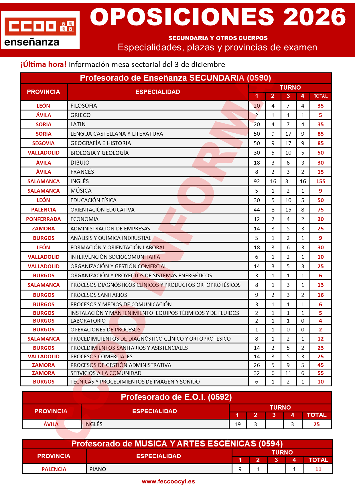 OPOSICIONES 2026 Secundaria y otros cuerpos Especialidades, plazas y provincias de examen