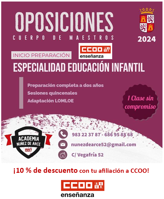 La Federación de Enseñanza de CCOO de Castilla y León ha firmado un convenio con la Academia Núñez de Arce que permite a sus afiliados y afiliadas beneficiarse de un 10 % de descuento en todos sus servicios.