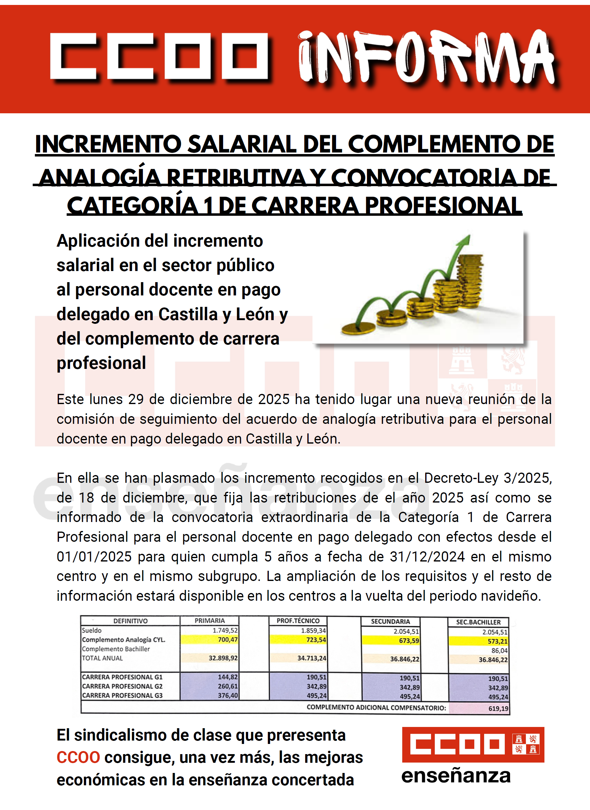 Enseñanza Concertada. Incremento salarial del complemento de analogía retributiva y convocatoria de Cat. 1 de carrera profesional